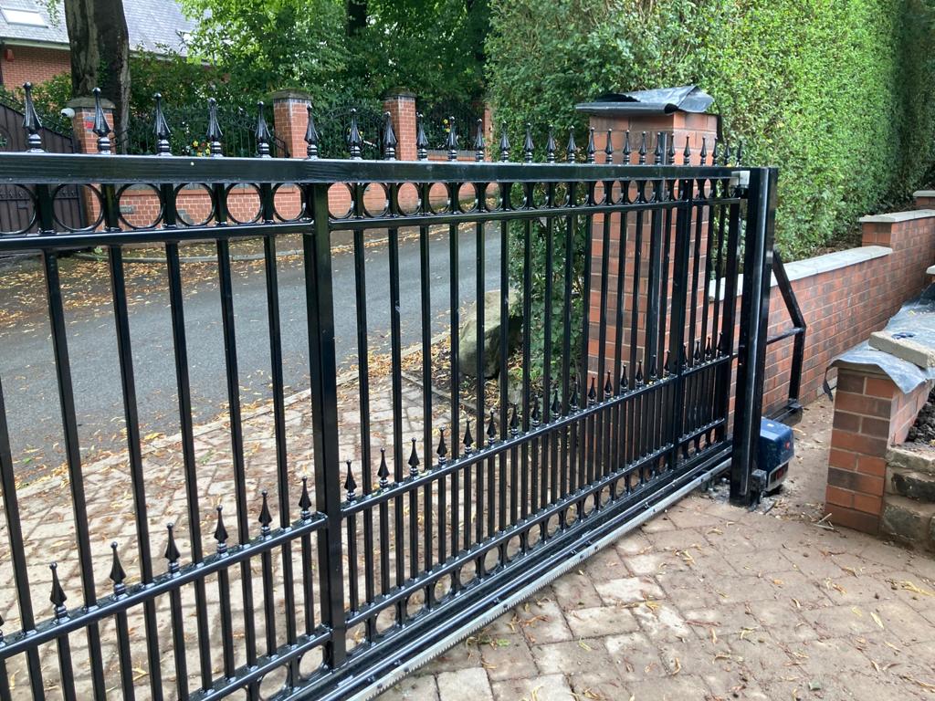 What did we do?: This home installation featured a steel cantilever sliding gate, designed to be semi-ornamental with a flat top and arrow heads, circles, and dog bars at the bottom for additional safety. The gate was fully automated with a BFT motor and all the required safety edges, as well as photocells fully compliant to BS/EN 12453.