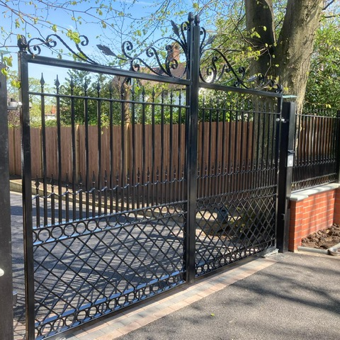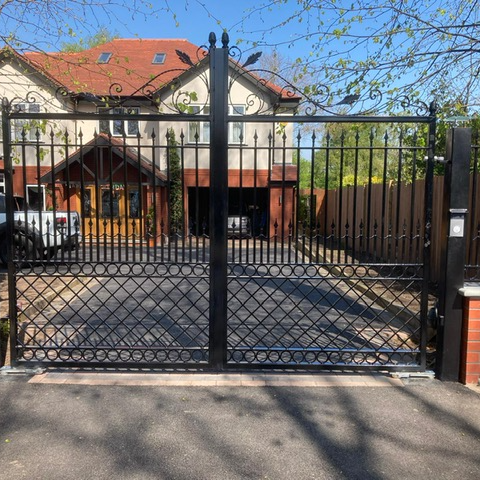 What did we do?: This job included fitting a pair of fabulous bespoke ornamental gates with matching wall-top railings and a pedestrian gate. The gates were then automated with underground motors and linked to the client’s home security management and entertainment system, meaning they never missed a visitor.