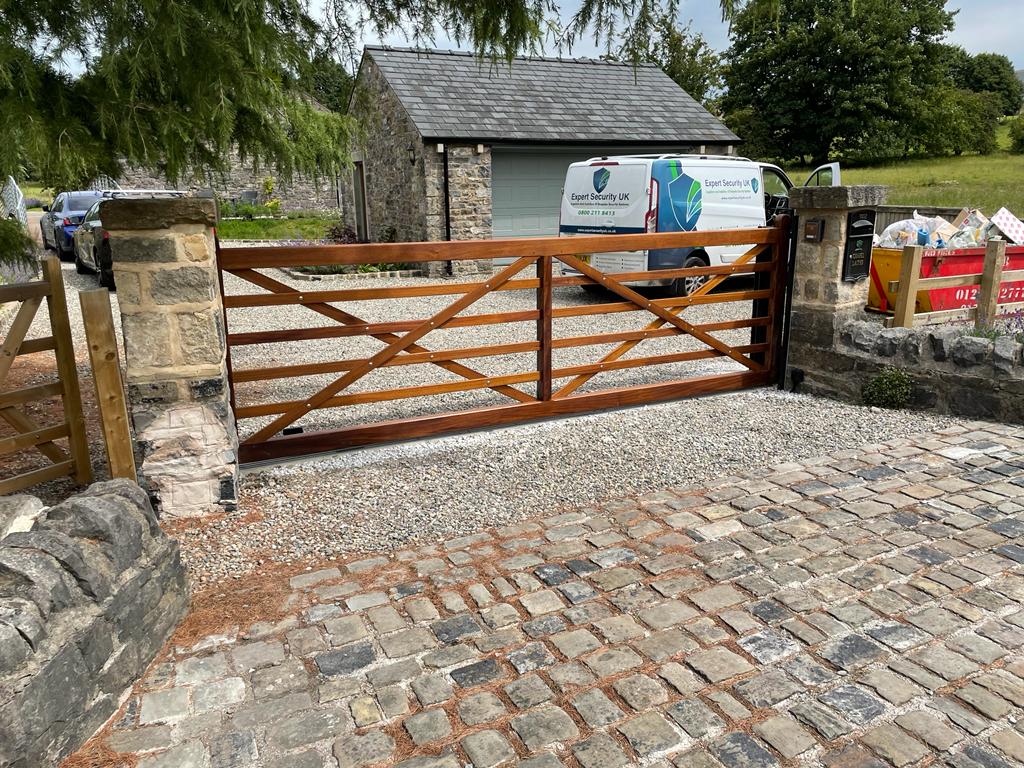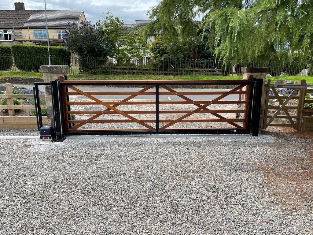 What did we do?: This home installation features a breathtaking five-bar style gate, made from Iroko hardwood and fixed to a steel frame to allow it to slide along the track. Fitted with all the required safety features and a Videx GSM Intercom system, the homeowner now has peace of mind that the property is secure.